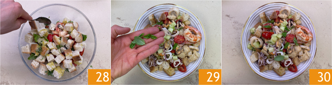 Mélangez bien afin de bien amalgamer tous les ingrédients 28. Dressez sur l'assiette et terminez avec quelques feuilles de basilic 29. Votre panzanella de mer est prête à être servie 30 !