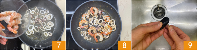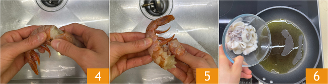 Passez au Comment nettoyer les crevettes : détachez la tête 4, puis enlevez la carapace 5 et l'intestin situé sur le dos de la crevette. Dans une poêle, chauffez un filet d'huile, puis ajoutez les calamars 6 et faites cuire à feu vif pendant 3 minutes.