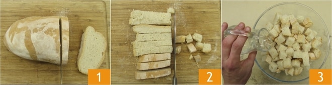 Pour réaliser la panzanella, commencez par couper le pain en tranches 1 puis en gros cubes 2. Transférez le pain dans un saladier et ajoutez l'eau et le vinaigre 3.