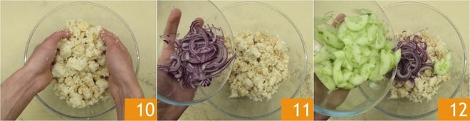 Reprenez le saladier avec le pain et mélangez à nouveau, puis ajoutez les oignons 11 et les concombres 12.