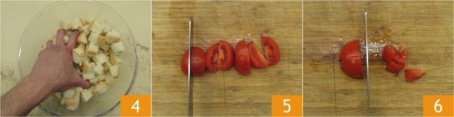Mélangez bien pour que le pain puisse absorber uniformément le mélange et mettez de côté 4. Passez à la préparation des légumes: coupez d'abord les tomates en quartiers 5 puis en morceaux plus petits 6.