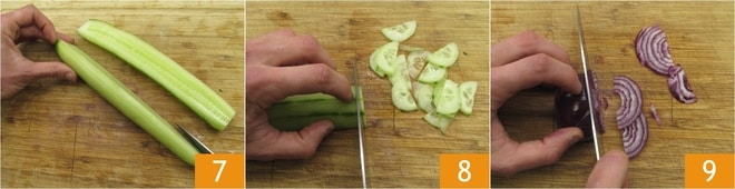 Enlevez la peau du concombre, coupez les extrémités et divisez-le en deux dans le sens de la longueur 7, puis coupez-le en fines tranches 8. Enfin, épluchez l'oignon, coupez-le en deux et tranchez-le finement 9.