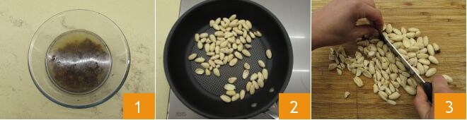 Pour réaliser les papassini, commencez par faire tremper les raisins secs dans l'eau 1. Faites griller les amandes dans une poêle 2 puis hachez-les grossièrement 3.