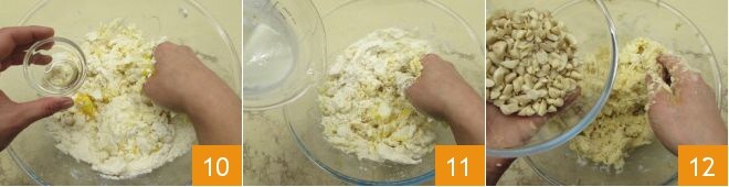 Assaisonnez avec l'extrait d'amandes 10, ajoutez le lait mélangé à l'ammoniaque 11 et les amandes grillées et hachées 12.