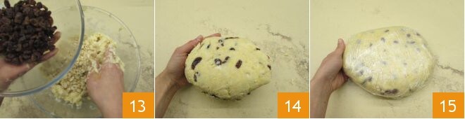 Enfin, incorporez les raisins secs ramollis 13 et pétrissez jusqu'à obtenir un pâton homogène 14. Enveloppez-le de film alimentaire 15 et placez-le au réfrigérateur pendant au moins une heure.