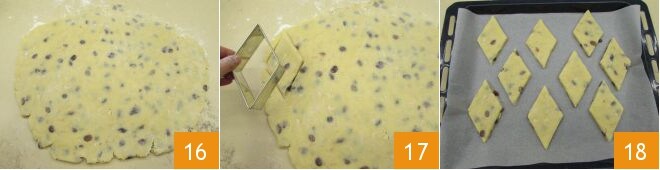 Après ce temps, reprenez la pâte et étalez-la avec un rouleau à pâtisserie sur un plan légèrement fariné jusqu'à une épaisseur de 1 cm 16. Découpez des losanges avec un emporte-pièce à biscuits 17. Travaillez les chutes de pâte pour réaliser d'autres biscuits jusqu'à épuisement de la pâte. Déposez les biscuits sur une plaque recouverte de papier sulfurisé 18 et faites cuire dans un four statique préchauffé à 180°C pendant 30 minutes.