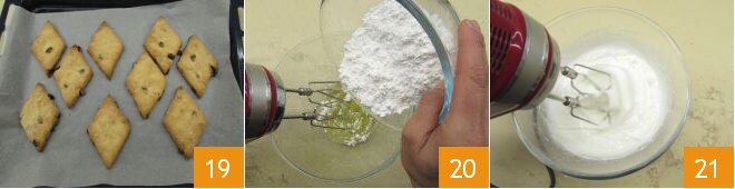 Une fois la cuisson terminée, sortez les papassini du four et laissez-les tiédir 19. Pendant ce temps, réalisez le glaçage : dans un bol, versez les blancs d'œufs et le sucre glace 20, montez le mélange avec un fouet électrique jusqu'à ce qu'il soit blanc et épais, il doit être facile à étaler 21.