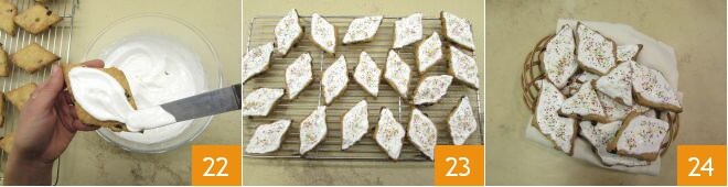 Recouvrez les biscuits avec le glaçage en utilisant une spatule 22. Garnissez immédiatement de vermicelles colorés et placez-les sur une grille pour faire sécher le glaçage 23. Les papassini sont prêts à être dégustés 24.