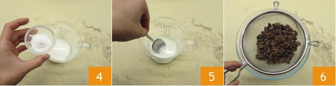 Versez l'ammoniaque dans le lait tiède 4 et mélangez pour la dissoudre 5. En attendant, égouttez les raisins secs qui se seront ramollis 6.