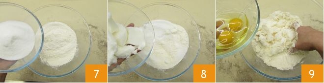 Dans un bol, versez la farine et le sucre 7, ajoutez aussi le saindoux 8. Commencez à travailler la pâte avec les mains, puis versez les œufs 9.
