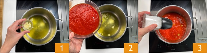 Pour préparer la pappa al pomodoro, dans une casserole, chauffez légèrement l'huile, épluchez l'ail et coupez-le en fines tranches (si vous ne l'appréciez pas, vous pouvez l'utiliser entier avec sa peau et le retirer par la suite). Faites-le revenir 1, puis ajoutez la pulpe de tomate 2 et un peu de sel 3. Faites cuire doucement pendant une bonne demi-heure.