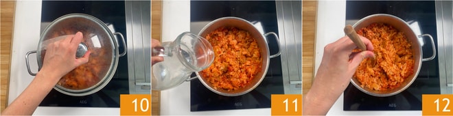 Couvrez avec le couvercle 10 et laissez reposer environ 15 minutes. Après ce temps, le pain sera bien imbibé de sauce, ajoutez encore de l'eau si nécessaire 11 et mélangez bien 12. Remettez sur le feu et laissez cuire doucement pendant encore 5 minutes ou jusqu'à atteindre la consistance désirée : les tranches de pain doivent se désintégrer complètement et créer une sorte de "pappa".