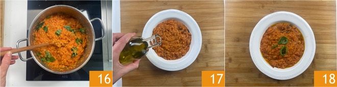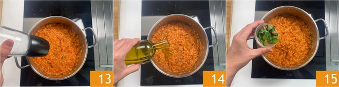 Éteignez le feu et rectifiez le sel 13, puis complétez avec un généreux filet d'huile 14 et quelques feuilles de basilic 15.