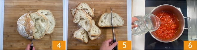Entre-temps, coupez le pain en tranches 4 et divisez-les en deux 5. Lorsque la sauce est prête, allongez-la avec un peu d'eau 6 (la quantité d'eau peut varier en fonction du type de pain utilisé).