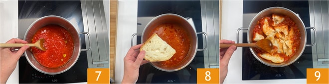 Mélangez 7 et immergez les tranches de pain, en les émiettant si nécessaire pour les faire entrer dans la casserole 8. Appuyez légèrement avec la louche 9.