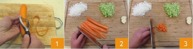 Pour préparer les pappardelle au ragoût de sanglier, commencez par la préparation du condiment. Coupez et épluchez la carotte avec un économe 1, retirez également les filaments les plus externes du céleri et nettoyez l'ail et l'oignon. Lavez et hachez finement le tout, en réservant l'ail entier (2-3).