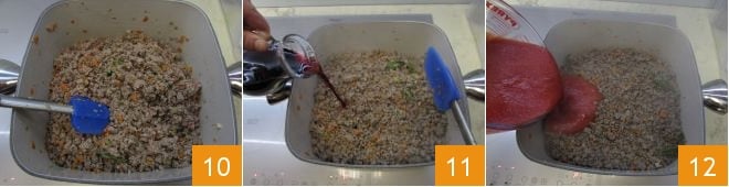 Augmentez légèrement le feu et laissez rissoler le tout pour encore 10 minutes en remuant avec une spatule 10, de manière à cuire la viande uniformément. À ce point, déglacez avec le vin rouge 11 et seulement lorsque la partie alcoolique sera totalement évaporée, ajoutez la purée de tomates 12.