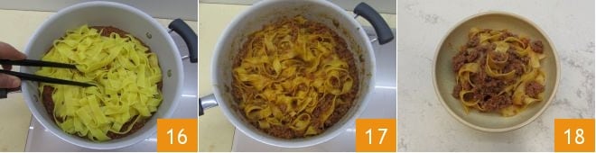 Entre-temps, transférez le ragoût dans une grande casserole, égouttez les pâtes et versez-les dans la poêle avec le condiment 16, mélangez jusqu'à bien amalgamer le tout 17 et servez vos pappardelle au ragoût de sanglier encore chaudes 18.