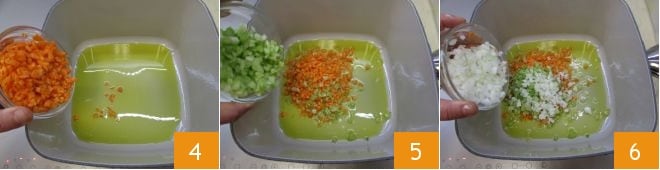 Versez l'huile dans une casserole à fond épais et ajoutez les carottes 4, le céleri 5 et l'oignon haché 6.