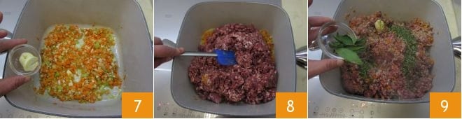 Ajoutez également l'ail en gros morceaux (ainsi vous pourrez le retirer plus facilement à la fin de la cuisson) et laissez mijoter le tout pendant une dizaine de minutes à feu doux 7. Ajoutez également le hachis de sanglier 8, le romarin haché et les feuilles de laurier 9.