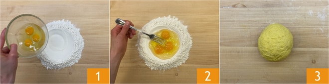 Pour préparer les pappardelle farcies au ragoût de lapin, commencez par les pâtes fraîches. Sur un plan de travail, disposez la farine en fontaine 1, cassez les œufs au centre, battez-les rapidement 2 et pétrissez jusqu'à obtenir une pâte lisse et homogène 3. Enveloppez-la dans du film plastique et laissez-la reposer au réfrigérateur pendant 30 minutes.