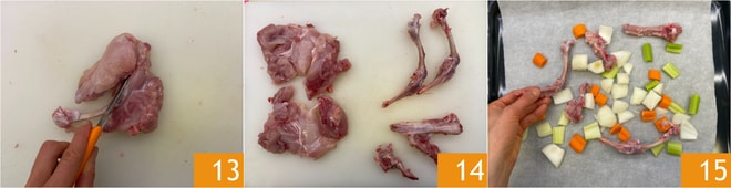 Désossez les cuisses de lapin 13, en séparant la viande des os 14. Mettez ces derniers sur une plaque recouverte de papier sulfurisé avec des carottes, du céleri et des oignons coupés en morceaux 15. Faites griller au four à 200°C pendant 20 minutes.