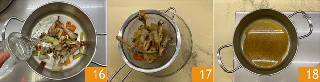 Transférez le tout dans une casserole avec un filet d'huile, couvrez avec de l'eau froide 16 et faites cuire pendant 30 minutes. Filtrez à travers une passoire 17 et réduisez le fond de cuisson de ¾ 18. Vous obtiendrez ainsi un délicieux jus de lapin.