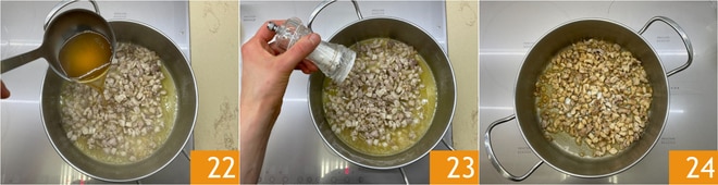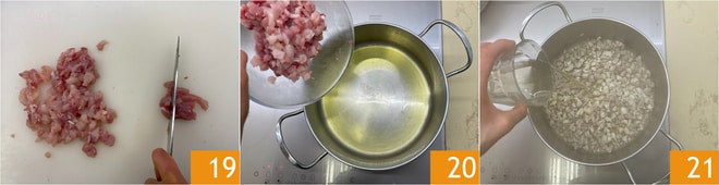 Coupez la viande en cubes d'un demi-centimètre 19 et mettez-les dans une casserole avec un filet d'huile 20. Faites rissoler pendant quelques minutes puis déglacez avec le vin blanc 21.