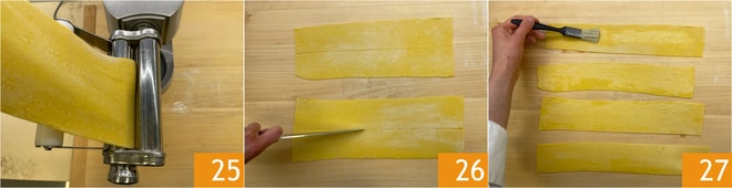 Entre-temps, reprenez la pâte du réfrigérateur et étalez-la avec une machine à pâtes 25. Coupez les feuilles en deux, dans le sens de la longueur 26. Badigeonnez les pappardelle avec de l'eau 27.