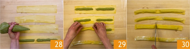 Avec une poche à douille, déposez au centre de chaque pappardelle le mélange de pois et de joue de porc, créant deux bandes d'environ 15 cm 28. Refermez la pâte, en scellant bien les bords 29 et coupez à l'endroit laissé vide 30.