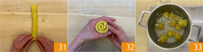 Enroulez chaque pappardelle sur elle-même 31 jusqu'à former de petits rouleaux 32. Faites cuire dans de l'eau bouillante salée 33.
