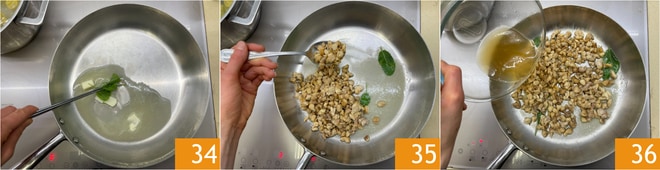 Dans une poêle, faites fondre du beurre et ajoutez la sauge 34, le ragoût de lapin 35 et le jus de lapin 36.