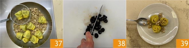 Égouttez les pappardelle et ajoutez-les à la sauce 37, faites cuire pendant 2-3 minutes, juste le temps de les imprégner de saveur. Entre-temps, hachez finement les olives noires avec un couteau 38. Dressez d'abord les pappardelle, puis le ragoût de lapin 39.