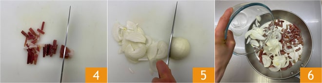 Entre-temps, coupez la joue de porc en lanières 4 et l'oignon en tranches 5. Dans une poêle, versez un filet d'huile, ajoutez la joue de porc et les oignons 6. Faites rissoler à feu doux pendant quelques minutes.