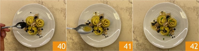 Ajoutez les olives 40, une cuillère de jus de lapin 41 et quelques feuilles de marjolaine fraîche. Les pappardelle farcies au ragoût de lapin sont prêtes à être servies 42.