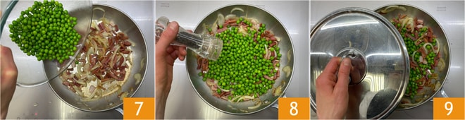 Ajoutez les pois 7, assaisonnez de sel et de poivre 8. Couvrez la poêle avec un couvercle 9 et faites cuire pendant 15 minutes.