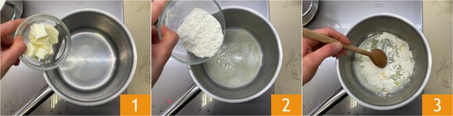 Pour préparer les paquets de lasagnes aux courgettes, commencez par la béchamel : dans une petite casserole, faites fondre le beurre 1, puis ajoutez la farine 2. Remuez rapidement avec une cuillère pour que le beurre fondu absorbe la farine 3.