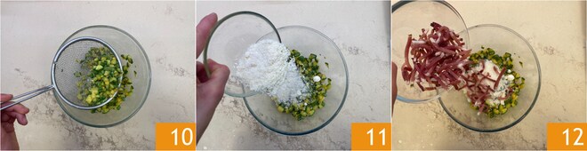 Une fois les courgettes prêtes, mettez-les dans un bol 10, assaisonnez-les avec le Parmigiano Reggiano DOP râpé 11 et le speck 12.