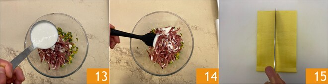 Ajoutez une louche de béchamel 13 et mélangez pour amalgamer la farce 14. Prenez maintenant les feuilles de pâtes fraîches : coupez chaque feuille en deux dans le sens de la longueur avec un couteau ou une roulette à pizza 15.