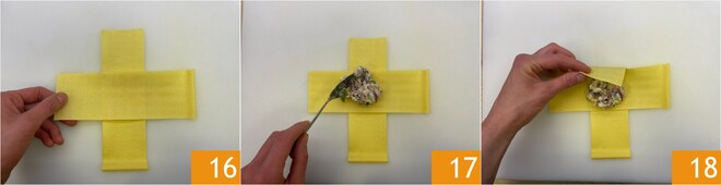Superposez les deux bandes obtenues en croix 16 et garnissez le centre avec une cuillerée de farce 17. Maintenant, repliez un bord de pâte vers le centre en partant de la bande la plus extérieure 18.