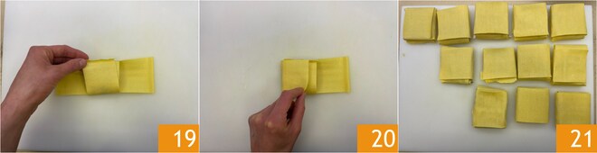Superposez également l'autre bord le plus extérieur 19, puis superposez les deux bords latéraux restants 20. Les paquets sont prêts, disposez-les sur un plateau avec la fermeture vers le bas 21.