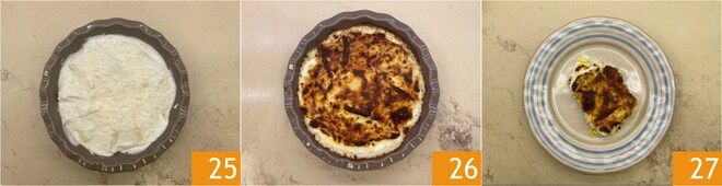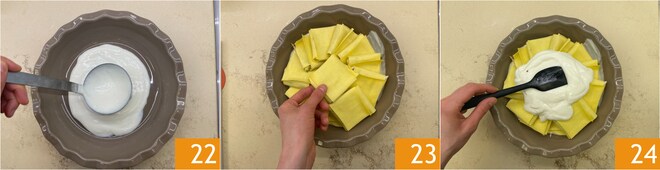 Prenez un plat allant au four, nous avons utilisé un moule évasé mesurant 19 cm à la base et 23 cm au bord. Versez une couche de béchamel au fond 22, puis disposez les paquets en cercle en les superposant légèrement 23. Recouvrez avec le reste de béchamel 24.