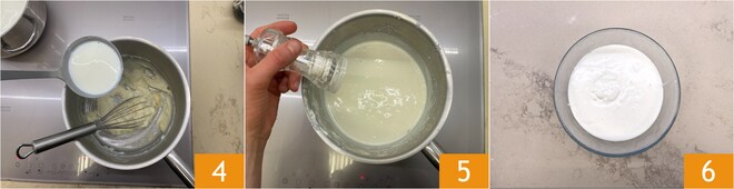Maintenant, versez le lait en continuant de remuer avec le fouet 4, afin d'éviter la formation de grumeaux. Continuez la cuisson à feu modéré pour épaissir la sauce qui devra être légèrement plus liquide, salez et poivrez à votre goût 5. Transférez la béchamel dans un bol et laissez-la refroidir 6.