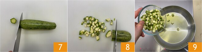 Maintenant, occupez-vous de la farce : lavez et coupez les extrémités des courgettes 7, puis coupez-les en petits dés 8. Dans une poêle, chauffez un filet d'huile d'olive vierge extra, ajoutez les courgettes 9 et faites cuire pendant 10 minutes à feu modéré.