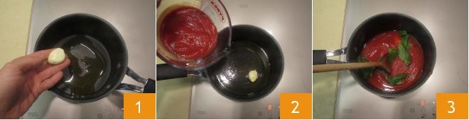 Pour préparer la parmigiana dans le sandwich, commencez par la sauce. Dans une petite casserole, faites chauffer un filet d'huile avec une gousse d'ail épluchée 1. Après quelques instants, ajoutez la purée de tomates 2 puis les feuilles de basilic. Mélangez, couvrez avec le couvercle et laissez cuire à feu doux pendant environ 25 minutes 3.