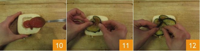 Passez à la garniture : versez sur la base vidée d'abord un peu de sauce 10, puis disposez à l'intérieur 3 tranches d'aubergines 11 en essayant de laisser un peu d'espace au centre 12.