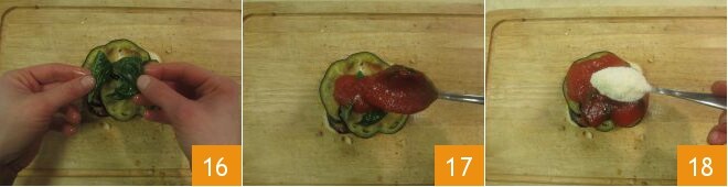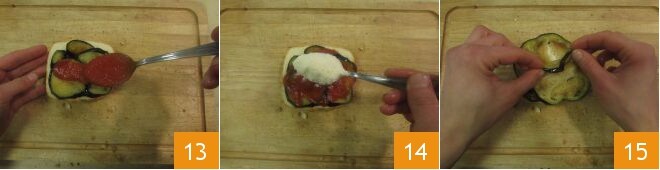 Continuez avec un peu de sauce 13, une cuillère de parmesan 14 puis deux autres tranches d'aubergines 15.