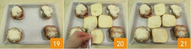 Au fur et à mesure, transférez les sandwichs garnis sur une plaque de cuisson avec du papier sulfurisé 19, ajoutez également les couvercles à part et saupoudrez-les de parmesan 20. Cuire le tout dans un four chaud à 200° pendant environ 10 minutes, puis passez en mode grill à 240° pour quelques minutes 21.