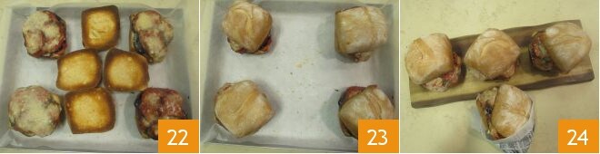 Faites juste dorer mais ne brûlez pas le pain 22. Ensuite, réunissez les couvercles respectifs avec les moitiés garnies 23 et votre parmigiana dans le sandwich est prête à être servie 24.