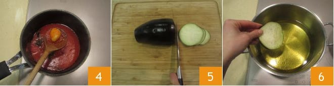 Laissez épaissir, mélangez de temps en temps et assurez-vous que ça ne brûle pas. À la fin de la cuisson, retirez l'ail et ajustez le sel à votre goût 4. Pendant ce temps, occupez-vous des aubergines : après les avoir lavées et séchées, tranchez-les à une épaisseur de 2-3 mm pour obtenir exactement 20 rondelles 5. Dans une petite casserole, faites chauffer une bonne quantité d'huile de pépins et lorsqu'elle est à 170° (nous vous conseillons de surveiller la température avec un thermomètre) plongez quelques morceaux à la fois 6.